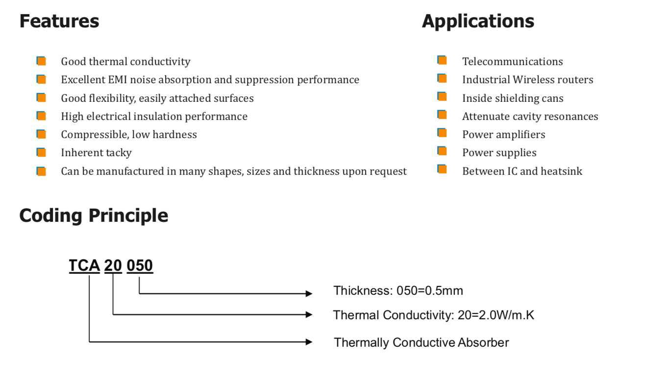 TM TCA系列導(dǎo)熱吸收材料是一種填充陶瓷和鐵氧體顆粒的硅基復(fù)合材料。設(shè)計用于吸收電磁噪聲(諧振腔、串擾和耦合)并填充熱界面之間的間隙。TCA系列吸收材料具有自粘性,組裝時不需要任何膠帶。" />