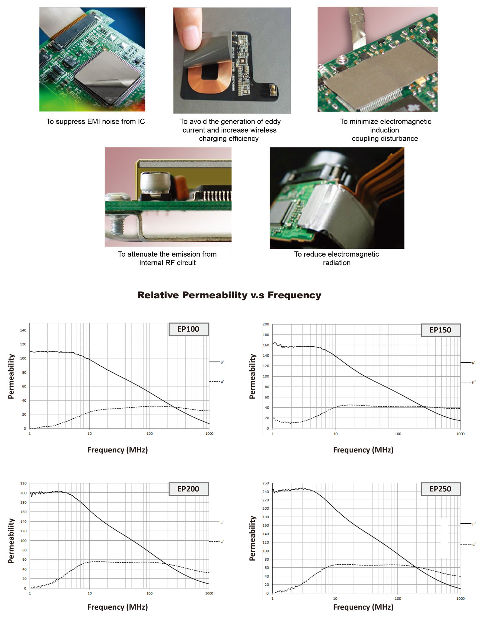 TM EP系列柔性磁吸收材料設(shè)計用于抑制電子設(shè)備產(chǎn)生的有害電磁波和高頻噪聲。本產(chǎn)品還可用于保護產(chǎn)品免受外部噪音的影響,從而減少由相鄰電子產(chǎn)品的電磁波引起的故障和干擾。" />